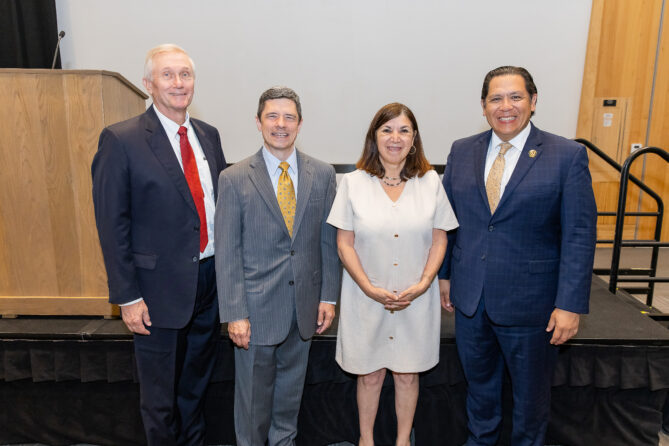 PHOTO (from left): Texas Access to Justice Foundation Treasurer Roland Johnson, Supreme Court of Texas Justice and TAJF liaison Brett Busby, TAJF Executive Director Betty Balli Torres, and State Bar of Texas President Santos Vargas during the TAJF Access to Justice Luncheon on October 20. Photo courtesy of the Texas Access to Justice Foundation.